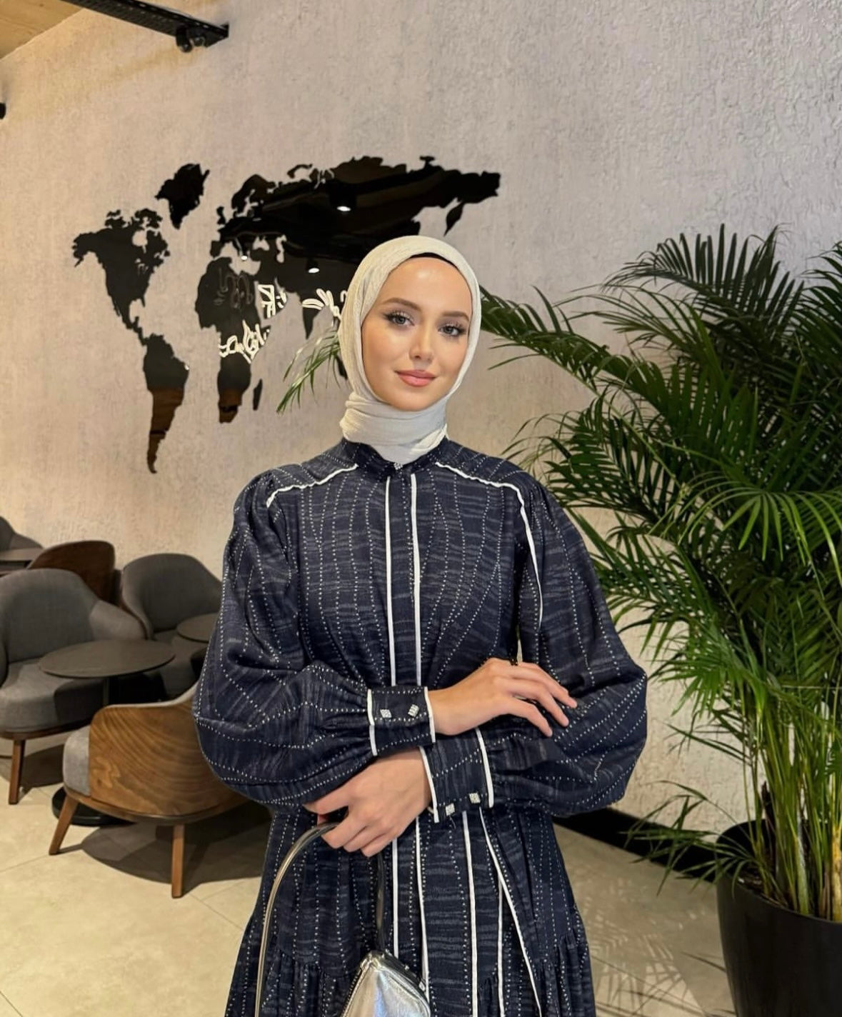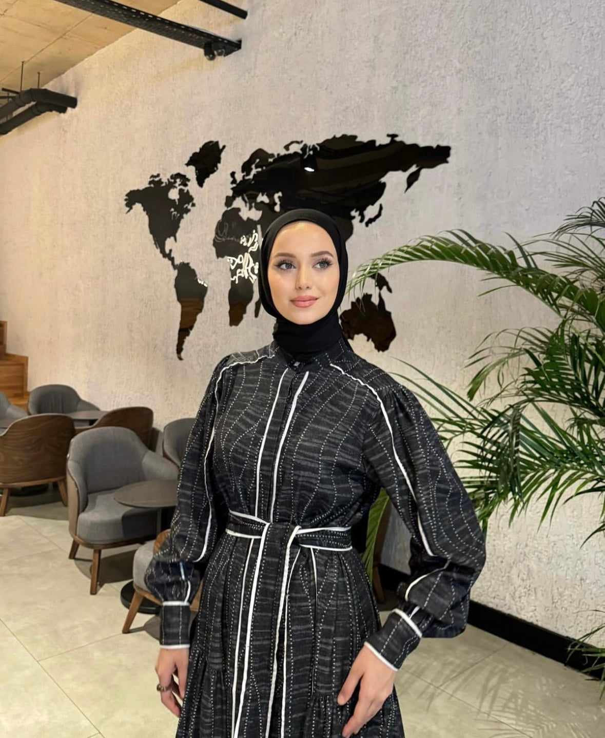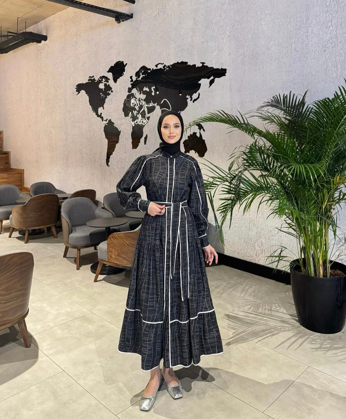 Modern and stylish maxi dress with a grid pattern and belt detail.