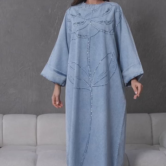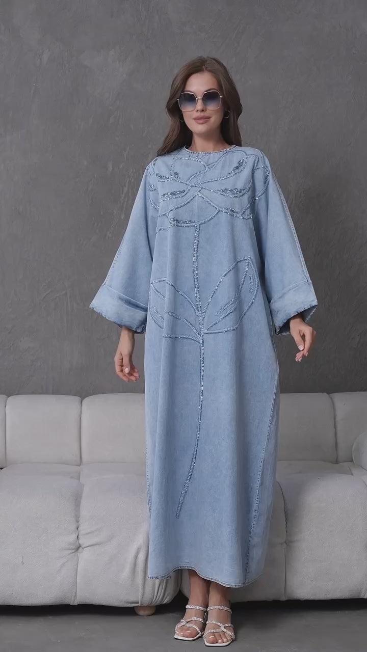 Stay effortlessly chic in this denim abaya featuring a statement floral sequin design, wide sleeves, and a relaxed fit for casual elegance with a modern twist.
