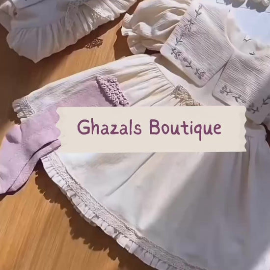 An elegant dress for girls aged 9-24 months featuring puff sleeves, a sailor-style embroidered collar with floral designs, a delicate lace bow at the waist, and ruffled lace trim along the hem. Perfect for special occasions, Eid, and gatherings.