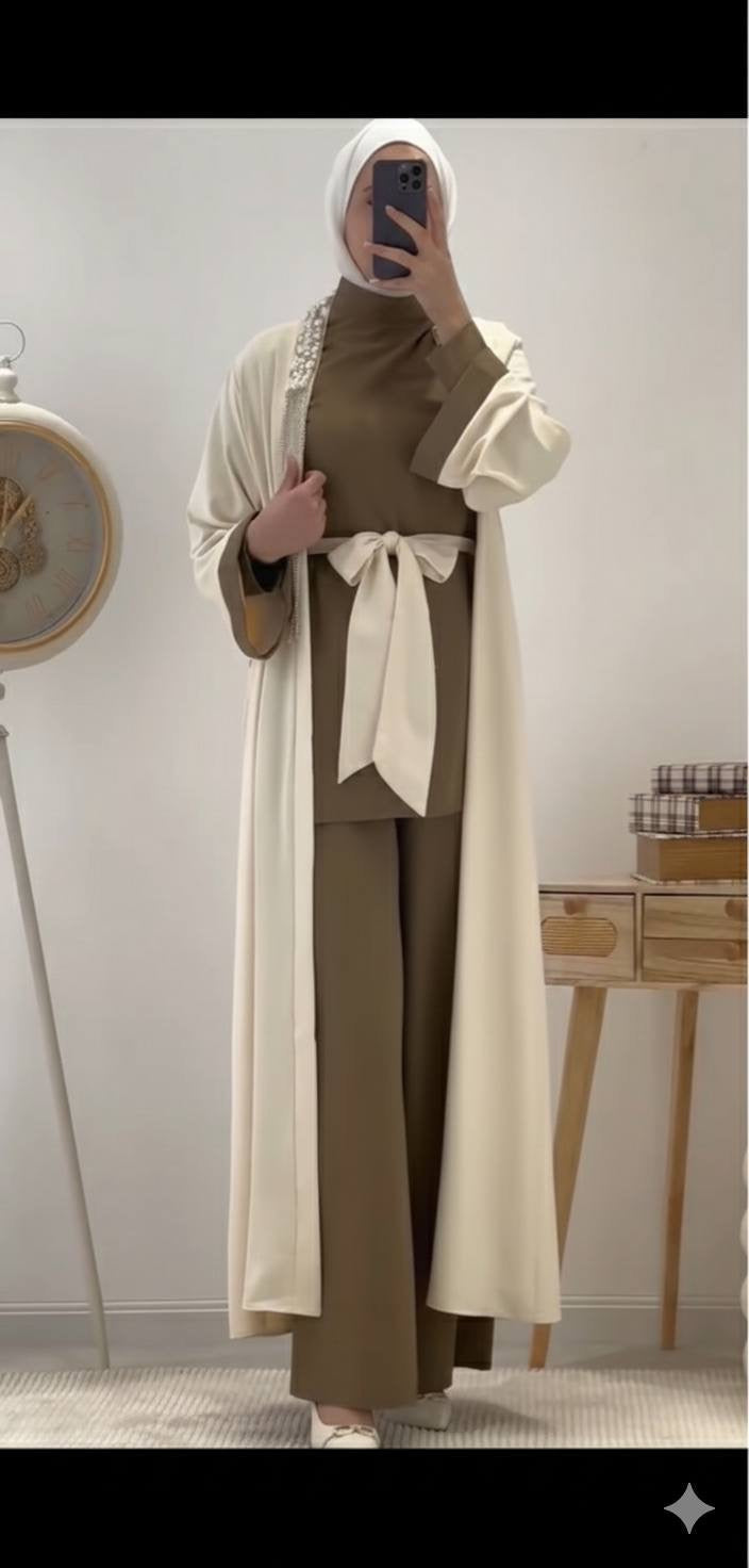 The Lina Three-Piece Modest Set is the perfect balance of elegance and everyday luxury. Designed with a flowing open abaya, matching inner tunic, and wide-leg pants, this set delivers a refined modest silhouette that moves beautifully with you.